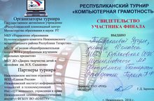 Ученица 10 класса Тимеркаева Язгуль приняла участие в финале республиканского турнира по компьютерной грамотности. Руководитель учитель английского языка Гараева А.Ф.
