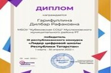 На основании Положения «О III республиканском конкурсе «Лидер цифровой школы Республики Татарстан», утвержденного приказом ГАОУ ДПО «Институт развития образования Республики Татарстан» от 22.02.2022 г. №90 признаны победителями конкурса 25 педагогов общеобразовательных организаций Республики Татарстан, набравших наибольшее количество баллов по всем критериям Конкурса. среди них и учитель татарского языка и литературы Гарифуллина Д.Р.