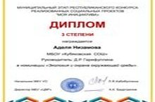 8 нче сыйныф укучысы Низамова А. "Минем инициатива" социаль проектлар республика конкурсының муниципаль этабында 3 нче дәрәҗә Дипломга ия булды. Җит. Гарифуллина Д.Р./ Ученица 8 класса Низамова А. приняла участие на муниципальном этапе республиканского конкурса социальных проектов "Моя инициатива" и награждена Дипломом 3 степени. Рук. Гарифуллина Д.Р.