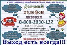 ДЕТСКИЙ ТЕЛЕФОН ДОВЕРИЯ - 8-800-2000-122 Дорогие ребята! Иногда вы можете столкнуться с трудной жизненной ситуацией, когда вам сложно найти выход из нее. Хорошо когда вы найдете поддержку в семье или среди друзей. Но, к сожаления, иногда вы не можете найти понимания среди них. Тогда вы можете рассказать о своей ситуации по ДЕТСКОМУ ТЕЛЕФОНУ ДОВЕРИЯ, где вас выслушают, помогут советом или конкретными действиями.