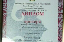 Призёр республиканской игры "Эко-перспектива" 03.06.2016 1,2 июня в Казани состоялся фестиваль дополнительного образования"Без бергэ".Наша районная команда из 18 человек была представлена во всех номинациях и соревнованиях фестиваля. Призером республиканской игры “Эко-перспектива” стал Амиров Инсаф (ученик Муслюмовского лицея, учитель Митрофанова А.К.), которому были вручены Почетная грамота Министерства образования и науки РТ и ценный сертификат.