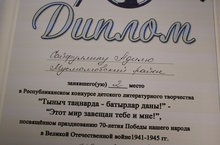 "Тыныч таңнарда - батырлар даны!" 23.12.2015 Ученица 3б класса Сайфуллина Адиля(кл.руководитель Иванова Светлана Анасовна) заняла 2 место в Республиканском конкурсе детского литературного творчества "Тыныч таңнарда - батырлар даны!" - "Этот мир завещан тебе и мне!", посвящённом празднованию 70-летия Победы нашего народа в Великой Отечественной войне 1941-1945гг.