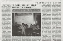 "Если бы я был бизнесменом" 19.11.2015 В МБОУ Муслюмовский лицей регулярно проводятся Уроки жизни. Один из таких уроков был проведен в 3а классе (классный руководитель Каржавкина А.А.) на тему "Если бы я был бизнесменом". Учащиеся узнали о плюсах и минусах работы предпринимателя, прочитали свои сочинения по данной теме. И в очередном номере районной газеты "Сельские огни" ( среда, 18 ноября 2015 года, №84 ) вышли отрывки этих сочинений.