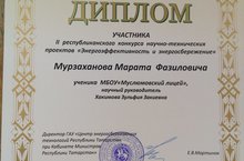 Достижения наших учащихся 11.06.2015 За активное участие во II республиканском конкурсе научно-технических проектов "Энергоэффективность и энергосбережение" учащиеся МБОУ Муслюмовский лицей Бикташева Алсу, Латипова Айсылу, Мурзаханов Марат под руководством учителя физики Хакимовой Зульфии Закиевны удостоились грамот ГАУ "Центр энергосберегающих технологий Республики Татарстан при Кабинете Министров Республики Татарстан".