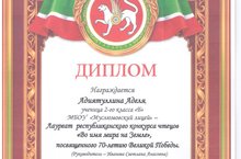 Лауреат республиканского конкурса чтецов "Во имя мира на Земле" 22.04.2015 Лауреатом республиканского конкурса чтецов "Во имя мира на Земле", посвященного 70-летию Великой Победы стала ученица 2б класса Адиятуллина Аделя (Руководитель - Иванова Светлана Анасовна). Молодцы!!!