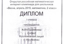 Достижения юных лицеистов по математике 22.04.2015 Результаты Открытой российской математической интернет-олимпиады для школьников "Весна, апрель 2015, математика, 2 класс": Шаймиева Азиля (2б класс) - Диплом I степени; Султанов Ильдар (2б класс) - Диплом II степени. Руководитель учащихся - учитель начальных классов лицея Иванова С.А. Поздравляем!!!