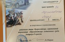 Учащиеся 9б класса получили 1 место в спортивных соревнованиях районного этапа Всероссийских соревнований школьников "Президентские состязания". Учитель Арсланов Ф.А. МОЛОДЦЫ!!!