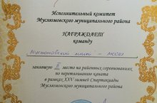 Ура! Сборная команда Муслюмовский лицей и МСОШ заняла 2 место в общекомандном зачете на соревнованиях районной XXV спартакиады среди предприятий и организаций Муслюмовского муниципального района посвященной 70-летию Великой победы. Поздравляем и желаем крепкого здоровья всем участникам соревнований!!!