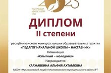 В рамках Года педагога и наставника, учительница начальных классов Каржавкина Альфия Ахтамовна награждена дипломом II степени республиканского конкурса лучших образовательных практик «Педагог начальной школы-наставник» в номинации «Опытный-молодому». Поздравляем!