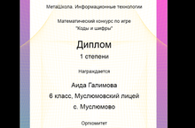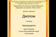 Шабаева Р. и Галимова А.( 6а класс) удостоились Дипломов 1 степени во Всероссийском математическом конкурсе-игре "Коды и шифры" (учитель Зиннатуллина Р.З.).Поздравляем!