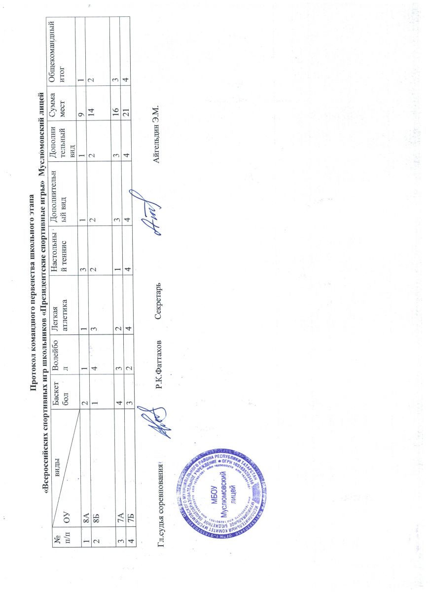 Протокол результатов легкоатлетического многоборья школьного этапа Всероссийских спортивных игр школьников "Президенские спортивные игры" Муслюмовского муниципального района обучающихся 2008-2009 г.р. МБОУ Муслюмовский лицей (юноши)