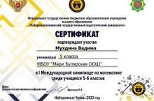 Ученик 5 класса Мухдин В.В. участвовал в I Международной олимпиаде по математике среди учащихся 5-6 классов, организованной Набережночелнинским государственным педагогическим университетом.