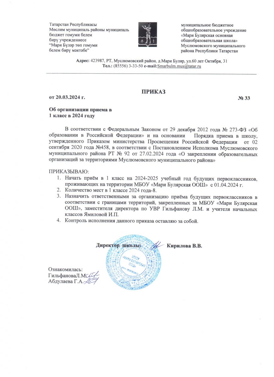 Приказ школы об организации приема 1 класс на 2024-2025 год