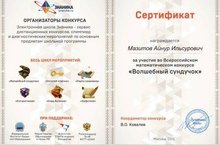 С 15 октября по 12 ноября ученики 5 класса участвовали в заочном конкурсе по математике "Волшебный сундучок", который проводился совместно с Московским физико-техническим институтом. Целью которого было дать возможность ребятам опробовать свои силы, проявить себя, подготовиться к другим математическим испытаниям, конкурсам, олимпиадам. За активное участие и за набранные баллы ученики, а именно, Мазитов А., Гимазетдинова Л., Игнатьева П., Акимова Н. были награждены сертификатами. (Руководитель Исламова Э.Р.)