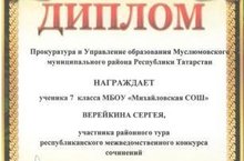 20 мая состоялось награждение победителей, призеров и участников республиканского межведомственного конкурса сочинений , организованный Прокуратурой совместно с Управлением образования Муслюмовского муниципального района РТ. Ученица 11 класса Сайфуллина А.И., стала победителем, учащиеся 10 класса Абдуллина Г.Н., Шаймарданова Н.Р.(руководитель Макарова О.Н.)стали призёрами и ученик 7 класса Верейкин С.О. ( руководитель Хафизова З.С.) был участником данного конкурса и награждены дипломами. Поздравляем!!!