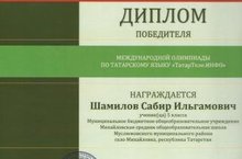 Награждается Дипломом победителя ученик 5 класса Шамилов Сабир, сертификатом участника ученик 7 класса Габидуллин Илшат за участие на международной олимпиаде по татарскому языку "ТатарТеле.ИНФО"