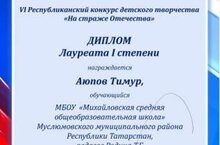 Аюпов Тимур и Сидякин Тимофей стали лауреатами 1 и 3 степени в Республиканском конкурсе "На страже Отечества". Руководитель Родина Татьяна Григорьевна. Молодцы!