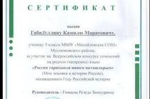 Награжден сертификатом ФГАОУ ВПО "Казанский (Приволжский) федеральный университет ученик 5 класса нашей школы Габидуллин Камиль Маратович за участие на Всероссийском конкурсе сочинений на родном (татарском) языке "Россия тарихында минем якташларым" ( Мои земляки в истории России), посвященного Году Российской истории. (Руководитель -Гимаева Резеда Зиннуровна).