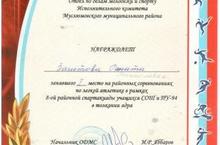 Отдел по делам молодежи и спорта Исполнительного комитета Муслюмовского муниципального района награждает ученицу 9 класса Гафурову Алию , занявшую 2 место на районных соревнованиях по легкой атлетике в рамках 8-ой районной спартакиады учащихся СОШ и ПУ-94 в забеге на 400 метров.