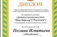 Ученица 1 класса Игнатьева Полина награждается дипломом отделами культуры и образования Муслюмовского муниципального района за активное участие в фестивале талантливых детей "Яшь бөреләр"("Росточки") в номинации художественное слово.
