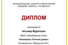 В муниципальном конкурсе скворечников "Каждому скворцу- по дворцу" Муратшин Альмир награжден дипломом в номинации "Уютный домик". Руководитель Габидуллин М.С.
