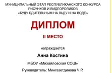 Воспитанница младшей дошкольной группы Костина Анна участвовала в муниципальном этапе республиканского конкурса рисунков и видеороликов "Буду бдительным на льду и на воде" и заняла 2 место. Поздравляем!!!