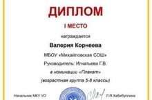 Ученица 6 класса Корнеева Валерия приняла участие в районном конкурсе "Мир без коррупции", посвященный Дню борьбы с коррупцией и заняла 1 место! Руководитель Игнатьева Г.В. Поздравляем!