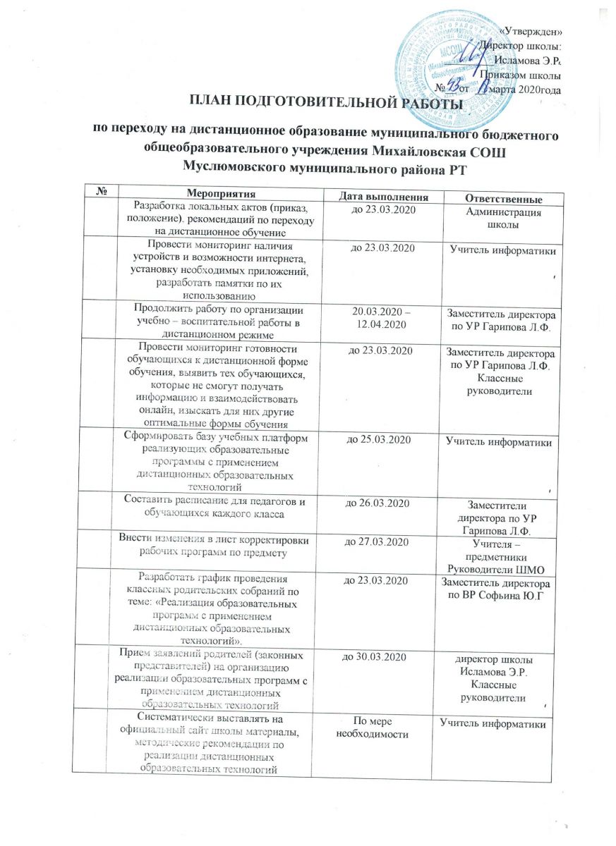 - План подготовительной работы к дистанционному обучению (март 2020год)