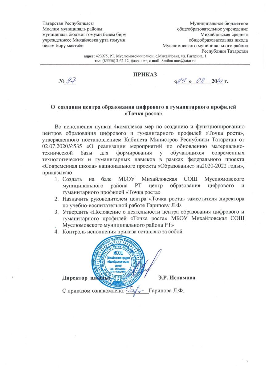 Приказ о создании центра образования цифрового и гуманитарного профилей "Точка роста"