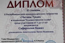 Республика күләмендә үткәрелгән балалар сәнгате “Без Тукайны укыйбыз” конкурсының “Нәфис сүз” номинациясендә 1 нче класс укучысы Сәфәргалин Камил 2 нче дәрәҗә диплом белән бүләкләнде.