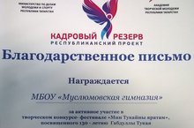 МБОУ "Муслюмовская гимназия" получило благодарственное письмо "За активное участие в творческом конкурсе - фестивале "Мин Тукайны яратам", посвященного 130-летию Габдуллы Тукая".