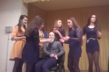 Сегодня в актовом зале гимназии проходит праздник "А ну-ка, девушки!". Ученицы 10 и 11 классов соревнуются между собой в умении вести себя на сцене, делать прически, красиво одеваться, а также петь и танцевать.