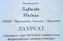 Ученица 4 класса Муслюмовской гимназии Харисова Инзиля стала лауреатом "Осеннего" тура 2013/2014 учебного года Всеороссийского заочного конкурса "Познание и творчество" в номинации "Удивительная природа".