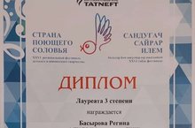 Ученица 6б класса Басырова Регина стала лауреатом 3 степени XXVI регионального фестиваля детского и юношеского творчества "Страна поющего соловья"