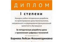 Подведены итоги республиканского конкурса учебно-методических разработок,организованных Елабужским Институтом КФУ. Учитель Гимназии Бариева Л.Ф. получила диплом I степени "За методическую разработку урока с применением цифровых технологий"