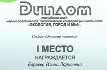 В республиканской научно- практической экологической конференции школьников "Экология, город, мы", в номинации " Экология человека" 1 место заняла Бариева Илина, обучающаяся 9 кл гимназии. Рук Бариева Л.Ф.