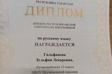 Ученица 10 Кл Гильфанова З. - призер республиканской олимпиады школьников по родному языку для обучающихся- татар школ с русским языком обучения. Учитель- Тимергалиева Э.В.