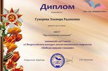 Поздравляем ученицу 5а класса Гумерову Эльмиру, занявшую 1 место во I Всероссийском конкурсе детско-юношеского творчества "Победа юными глазами". Руководитель - Хайруллина Ч.А.