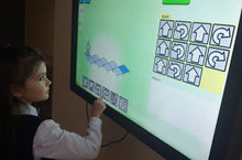В рамках Всероссийской образовательной акции "Урок цифры" ученики пробуют свои силы в логических тренажерах на интерактивных стендах.