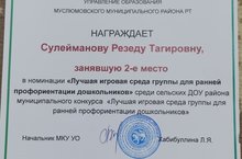 Мәктәпкәчә яшьтәге балалар төркеме тәрбиячесе Сөләйманова Резеда "Мәтәпкәчә яшьтәге балалар төркемендә һөнәр сайлауга юнәлдерелгән иң яхшы уен мохите" муниципаль конкурсында II урынга лаек булды. Коллегабызны котлыйбыз, эшендә уңышлар, яңа җиңүләр телибез!
