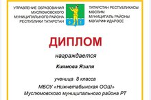 "Тукай укулары" муниципаль бәйгесендә III дәрәҗәдәге дипломга лаек булган 8 нче сыйныф укучысы Киямова Я. һәм аның укытучысы Хөсәенова Г. Ә. котлыйбыз. Иҗади уңышлар телибез!