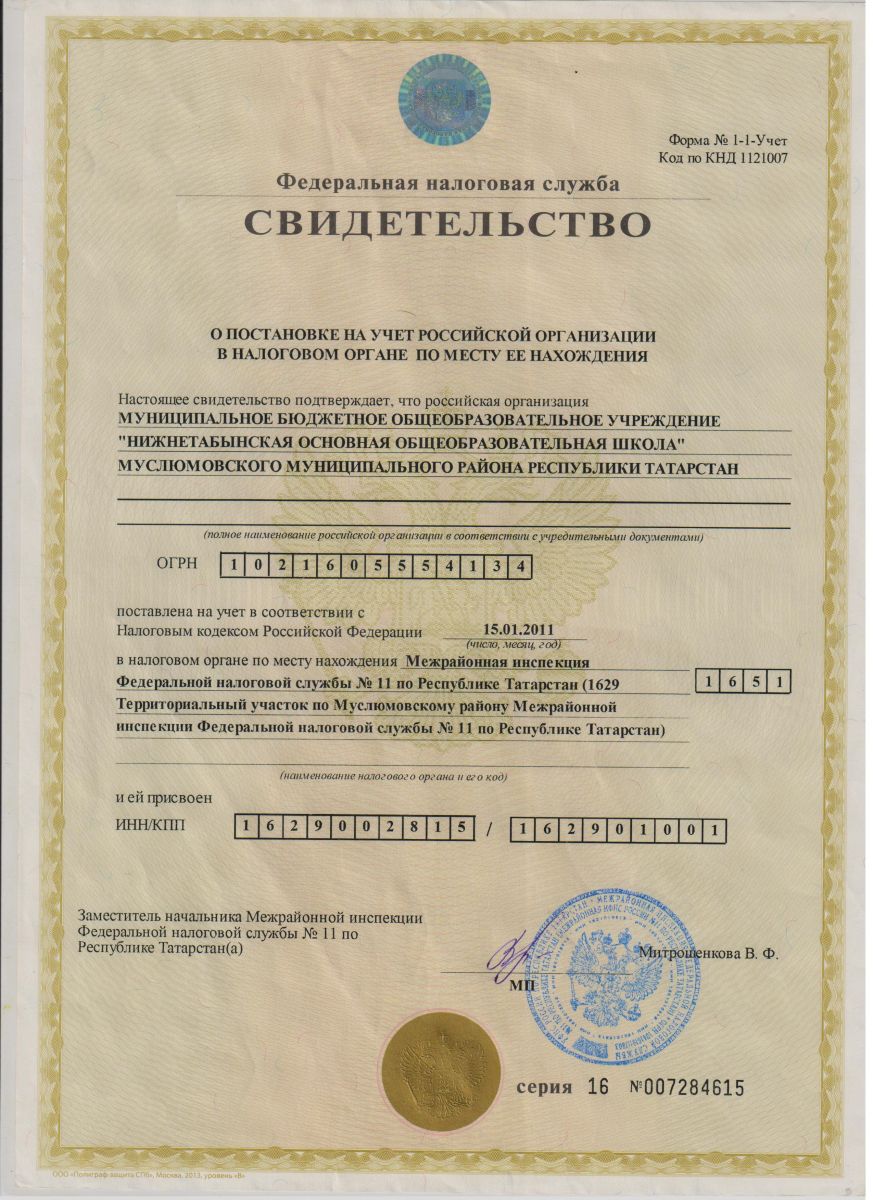 Свидетельство о постановке на учет в налоговом органе