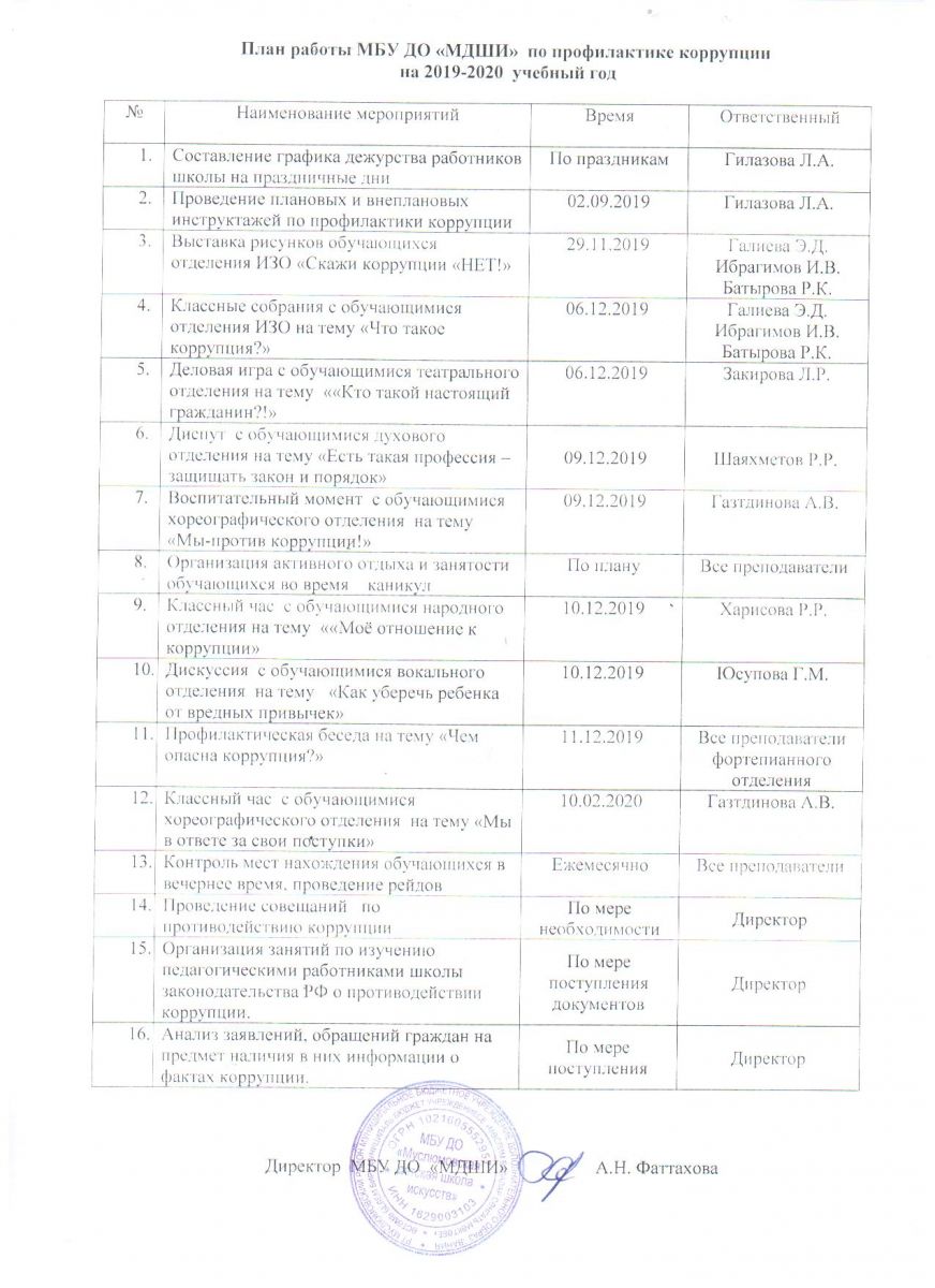 План работы МБУ ДО "МДШИ" по профилактике коррупции на 2019-2020 учебный год