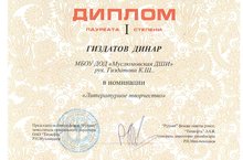 4 апрель көнне Әлмәт шәhәренең «Нефтьче» мәдәният сараенда «Рухият» фонды оештырган «Сандугач сайрар илем» исемле XVIII регионара балалар фестиваленең гала-концертында Мөслим сәнгать мәктәбе укучысы Динар Гыйздәтов катнашты. Ул «әдәби иҗат” номинациясендэ 1 дәрәҗә лауреат булды, диплом hәм кыйммәтле пакет белән бүләкләнде. Динарның җитәкчесе Кадрия Гыйздәтова. 06.04.2015