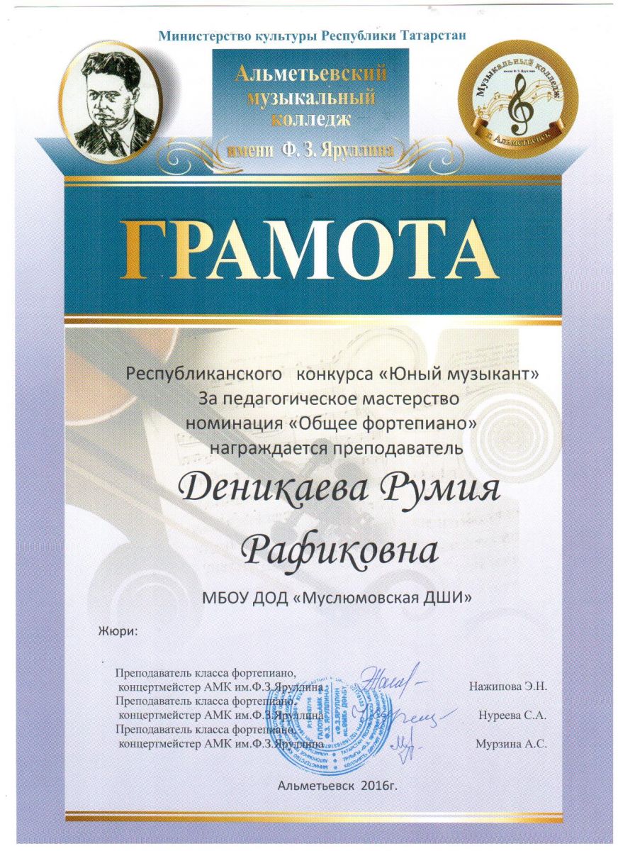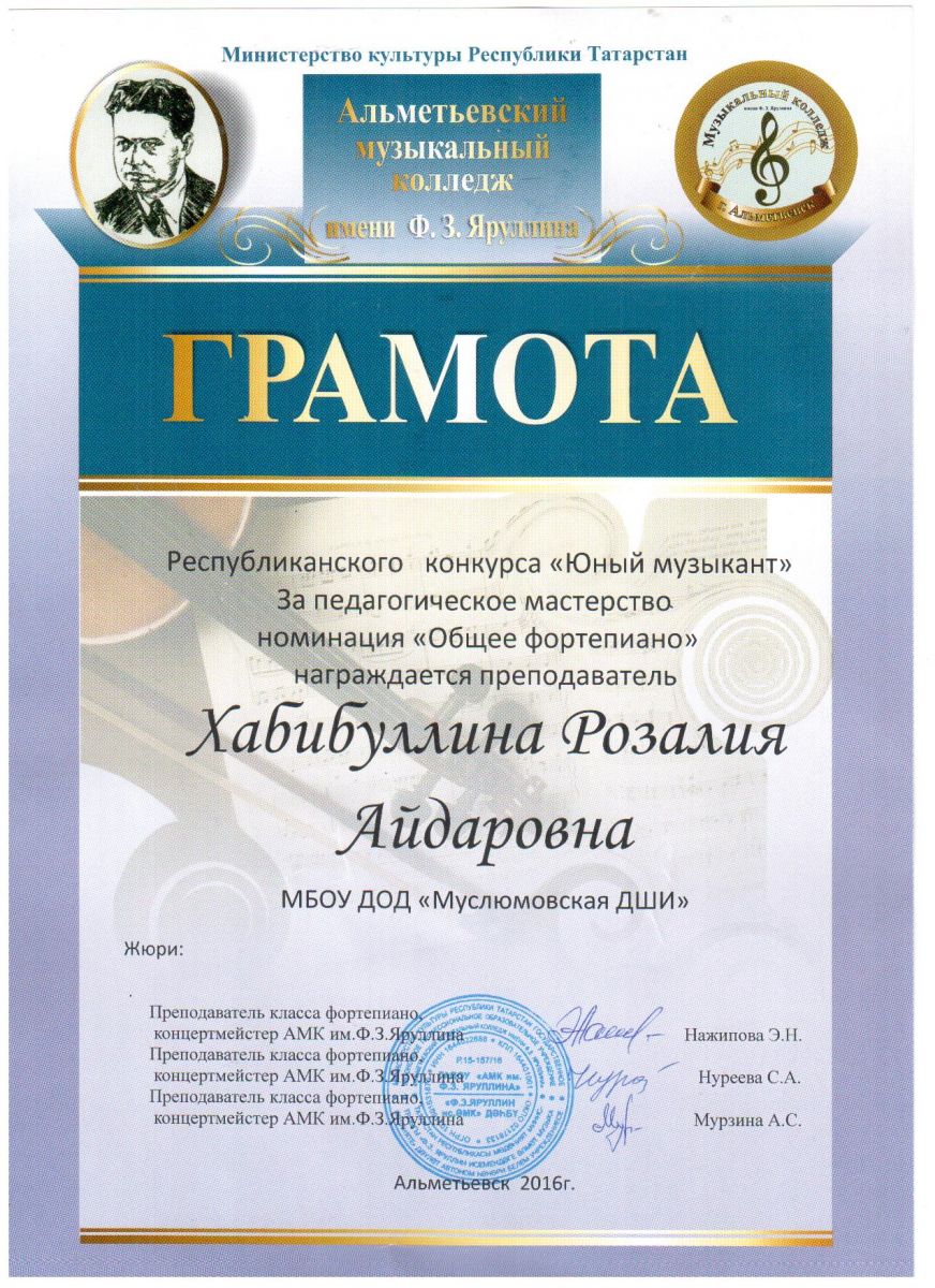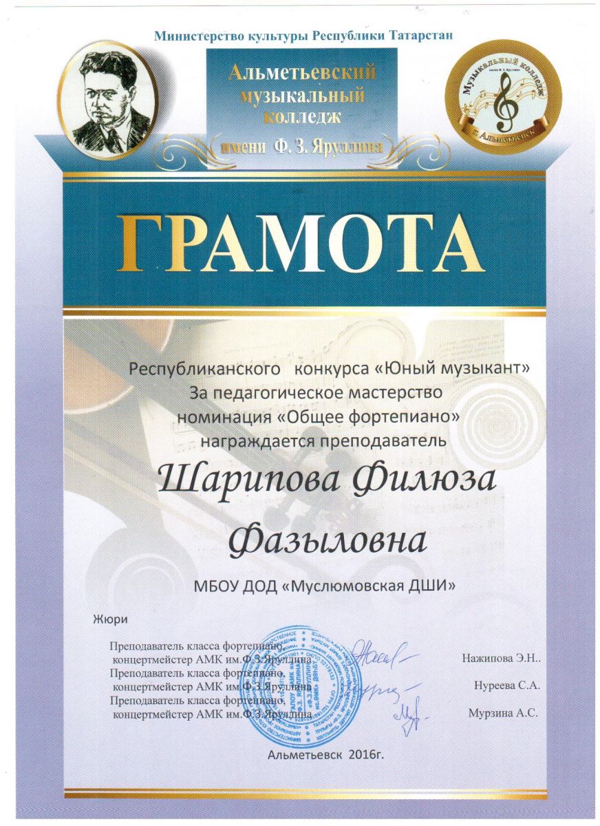 Шарипова Филюза Фазыловна. Грамота Республиканского конкурса "Юный музыкант" За педагогическое мастерство