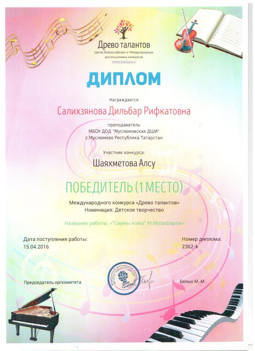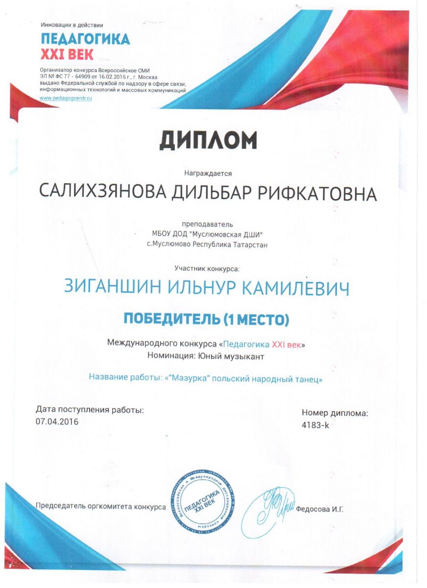 Салихзянова Дильбар Рифкатовна. Диплом международного конкурса "Педагогика XXI век" от 07.04.2016г.