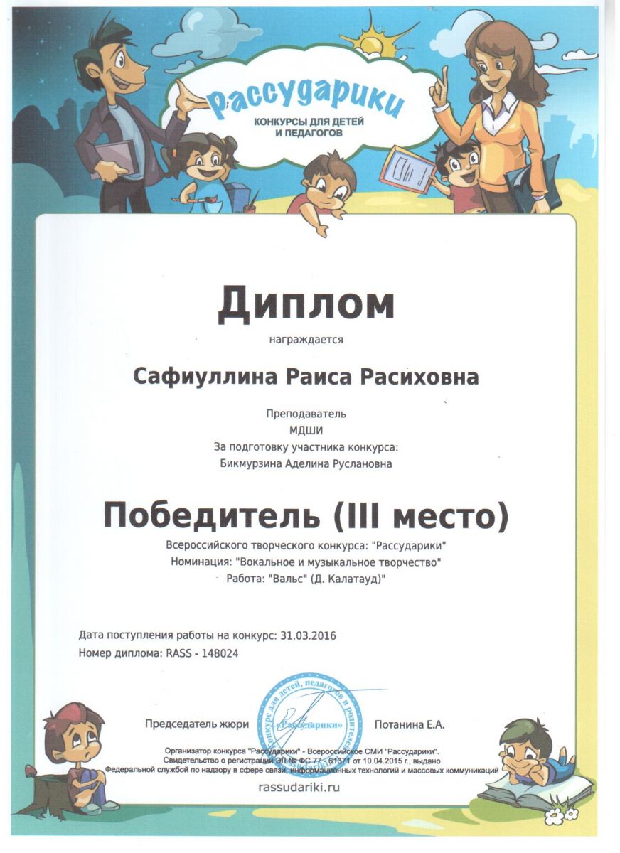 Сафиуллина Раиса Расиховна. Диплом Всероссийского творческого конкурса "Рассударики" от 31.03.2016