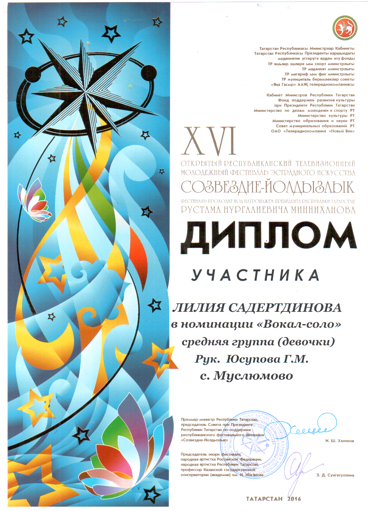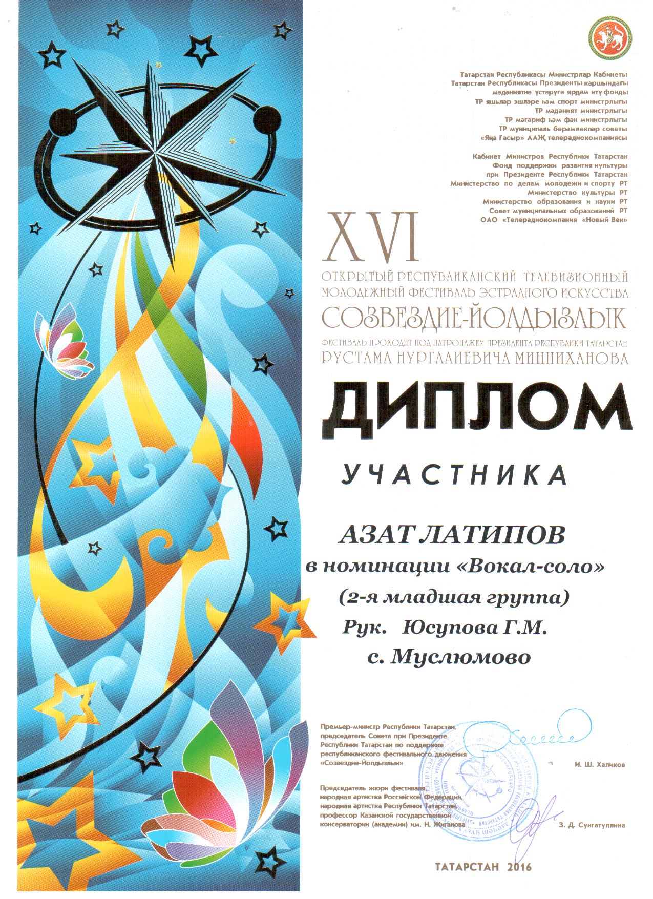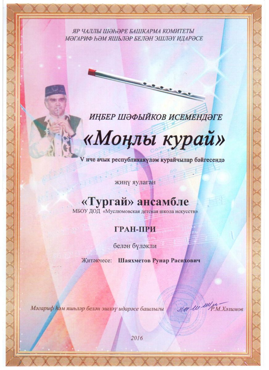 Киямова Язиля. Диплом лауреата I степени Республиканского конкурса "Юный музыкант" им. Ф.З. Яруллина