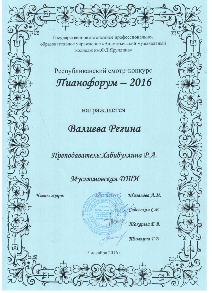 Валиева Регина. Диплом участника Республиканского смотр-конкурса "Пианофорум - 2016"