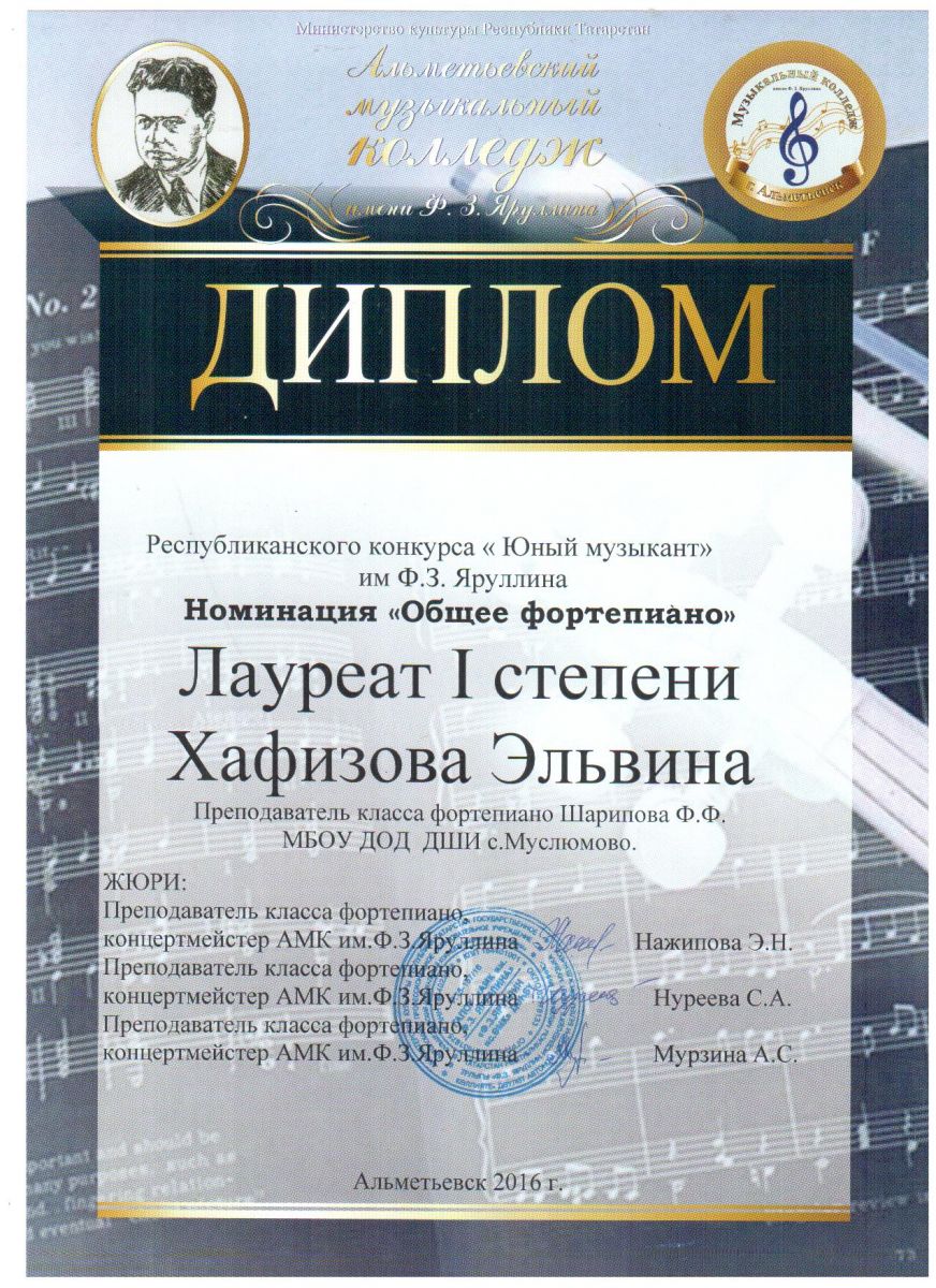 Хафизова Эльвина. Диплом лауреата I степени Республиканского конкурса "Юный музыкант" им. Ф.З.